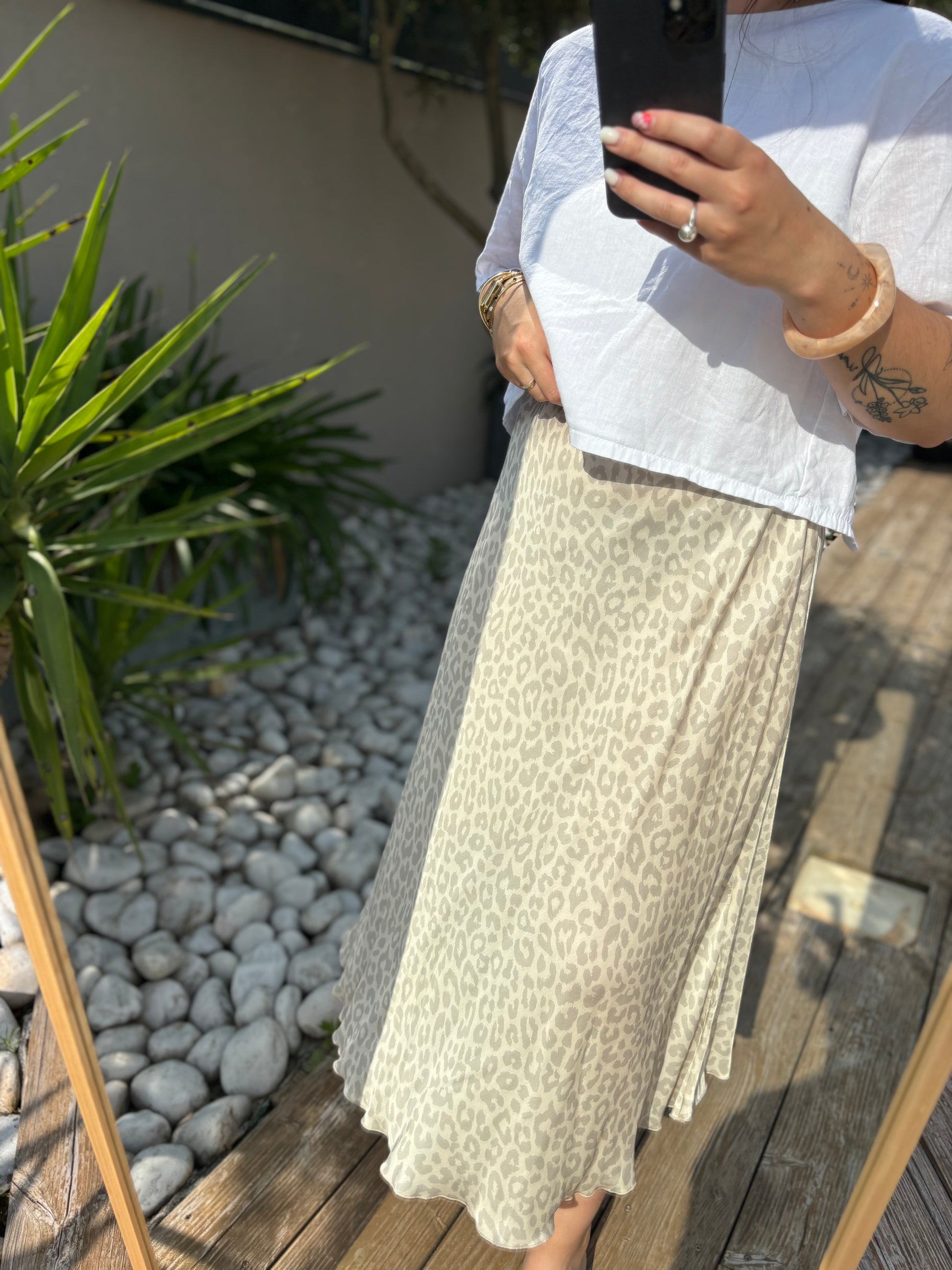 - Jupe mi-longue à motif léopard gris argenté/beige
